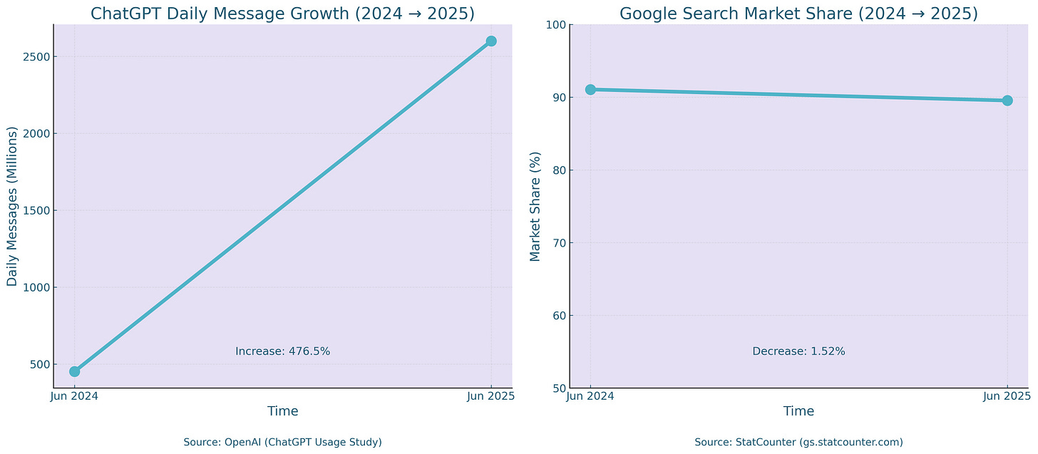 ChatGPT’s usage grew fivefold in the past year, with daily messages soaring from 451 million in June 2024 to 2.6 billion in June 2025.